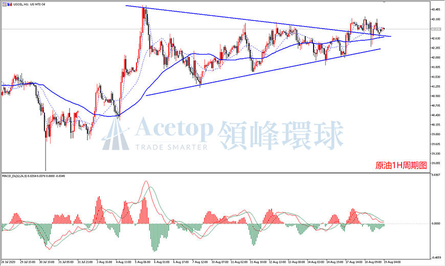 美原油继周一突破如图1小时周期收缩三角形结构之后,昨天在三角形上轨支撑上方保持震荡,依然表现强势。指标方面,MACD指标在零轴方的多头区域,在连续震荡后,目前快慢线已经接近零轴,有调整到位迹象。同时,更大的4小时和日线周期也保持震荡向上的趋势,建议继续看多为主。日内操作方面,建议依托上轨支撑,等待回调做多。